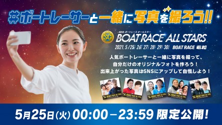 5月25日(火)、SG第48回ボートレースオールスター開催初日限定のウェブを活用したファンサービスとして「#ボートレーサーと一緒に写真を撮ろう!!」を実施いたします。オールスターに出場するレーサーの中から9名が登場。この日限りの限定サービスです。ぜひお楽しみください。