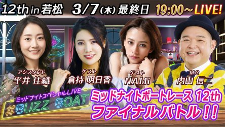2024年もミッドナイトボートレースで盛り上がろう!ミッドナイトボートレース12thはボートレース若松(3/1~3/7)で開催!「バズる」を目指して、豪華MC・ゲストがレース予想、トーク、様々な企画に挑戦。【ミッドナイトスペシャルLIVE #BUZZ BOAT】はYouTubeにて明日から節間毎日配信!
