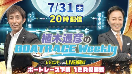 今回の「植木通彦のボートレースウィークリー」は7月31日(木)20時からLIVE配信!今村豊さんがリモート出演!植木通彦ボートレースアンバサダーと【下関12R優勝戦】をLIVE解説!