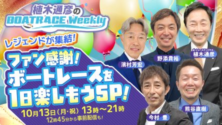 10月13日(祝月)13時から【植木通彦のボートレースウィークリー ファン感謝!ボートレースを1日楽しもうSP!】を8時間生配信!今村豊さん・熊谷直樹さん・濱村芳宏さん・野添貴裕さんが植木通彦ボートレースアンバサダーと当日開催のレースを解説!《12時45分頃から直前配信もお届け!》