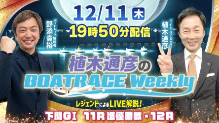 野添貴裕さんが【下関G1 11R準優勝戦・12R】をLIVE解説!「植木通彦のボートレースウィークリー」12月11日(木)19時50分から生配信!