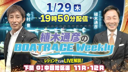 今回の「植木通彦のボートレースウィークリー」は1月29日(木)19時50分からLIVE配信!今村 豊さんがリモート出演!植木通彦ボートレースアンバサダーと注目の【下関 G1中国地区選11R・12Rドリーム戦】をLIVE解説!