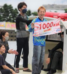 その後、ファンから贈られた、「1,000勝達成」のタオルを掲げ、水神祭を行い、多くの仲間たちから祝福されました。