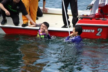 令和5年7月24日(月)、ボートレース鳴門において開催の鳴門渦潮歌手高瀬豊子杯競走4日目第1レースにおいて、福岡支部の132期・登録第5286号 坂井 滉哉 選手が6コースから「まくり差し」で1着、デビューから50走目でプロ初勝利を飾りました!! レース後にはファンの皆様の前で歓喜の水神祭が行われました。