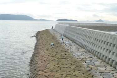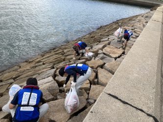 護岸沿いで清掃活動する参加者