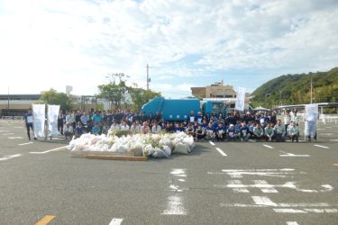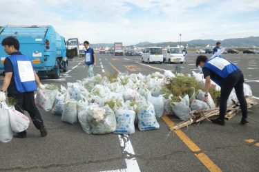 9月12日(金)朝7時に施行者職員・(一財)日本モーターボート競走会児島支部・(公社)日本モーターボート選手会岡山支部・当レース場で開催業務等に携わる事業者・現在実施しているスタンド棟の施設改修工事と選手宿舎建設工事に携わる事業者の149名が集合して、レース場周辺の海岸と道路において清掃活動を行い、ビニール袋やペットボトル等の可燃ごみ・空き缶等の不燃ごみ等、ゴミ袋にして210袋・約300キロを回収しました。