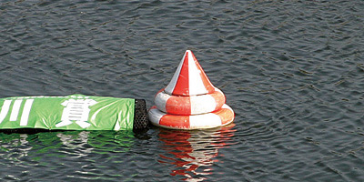 ボートを旋回させる地点の目印には赤と白で塗られたトンガリ帽子のようなブイが浮いている。これがターンマークである。正面スタンドから競走水面に向かって右側に浮いているのが第1ターンマーク、左側が第2ターンマーク。2つのターンマークの間は300mである。レースではスタート後それぞれのマークを3回ずつターンすることになる。ブイは3段になっていて、横幅は110cm、高さは95cmある。