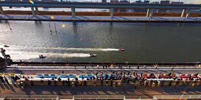 湖の一角、あるいは専用のプールを設けたボートレース場は淡水になる。淡水は海水よりも硬い。