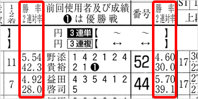 2着以内に入着する確率。レーサー、モーター、ボート、それぞれに2連対率がある。