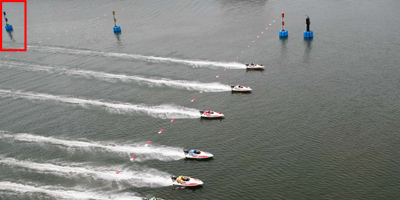 センターポールから第2ターンマークの方に向かって80mの位置に立っている標識ポール。青と白で交互に塗り分けられている。この80m標識ポールからはコースを横切る形で空中線標識がのびており、スタンド側では85mポールにつながれている。これはロープに青と白の正三角形の小旗がついたもの。例えば時速72kmで走ると、秒速は20mとなり、大時計の針が0秒を指す4秒前にこの80m標識ポール(空中線標識)を通過するのが1つの目安ともなる。