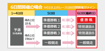 1節は予選から始まり、予選を勝ち進んだレーサーによる準優勝戦、そして優勝戦が開催される。優出とは節の最終日に開催される優勝戦に出場することをいう。