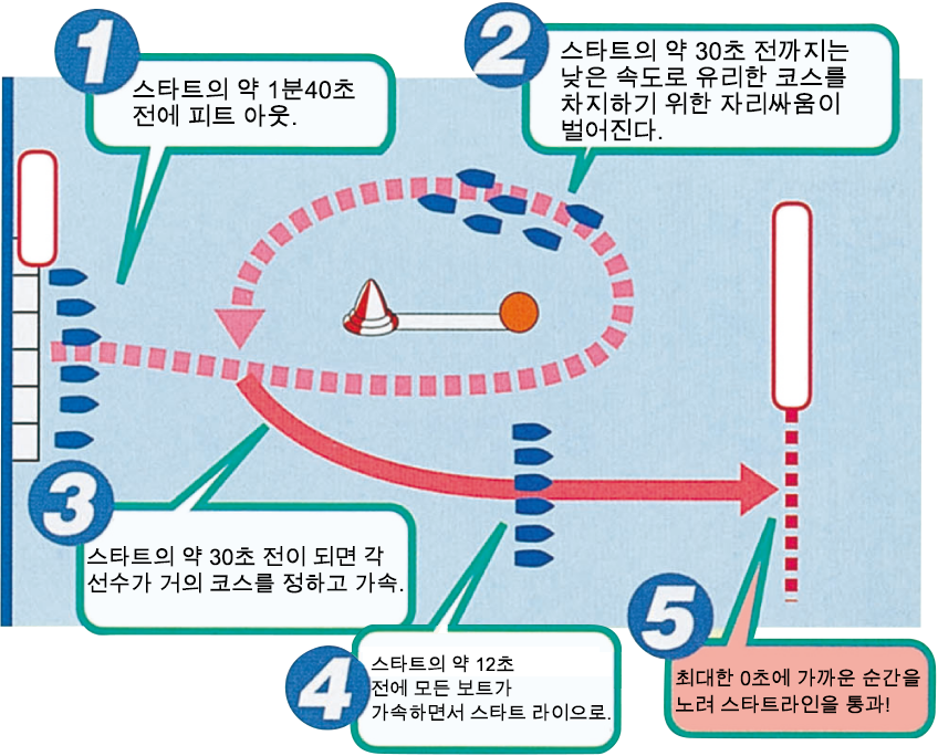 보트 레이스의 스타트는 육상경기의 스타트와는 달리 정해진 시간 내에 스타트라인을 통과해야 하는 플라잉스타트 방식이 채용되고 있다.
