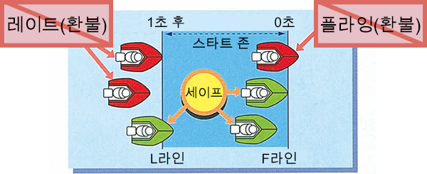 보트 레이스에서는 스타트라인을 다른 보트보다 먼저 통과하면 유리하지만, 대시계가 0초를 가리키기 전에 통과하면 「플라잉(F)」.
