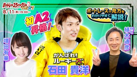 8月11日(木)19時からLIVE配信!次代を担うルーキー情報満載!!植木通彦ボートレースアンバサダー「ボートレースウィークリーNEXT」!今期初A2級に昇格!石田貴洋選手を紹介!