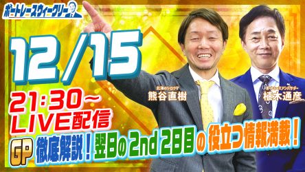 12月15日(木)21時30分から「ボートレースウィークリー」をLIVE配信!今回は熊谷直樹さんがリモート出演!植木通彦ボートレースアンバサダーと終わったばかりのグランプリ3日目トライアル2ndを徹底解説!翌日に役立つ情報満載! YouTube とBOATCASTで配信です!