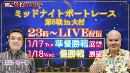 BOATBoy黒須田編集長とボートレースの話をしよう!明日1/17(火)23時からLIVE配信!BOATCAST・YouTube JLC公式CHで配信「週刊BOATBoy」最新情報をお届け! 「ミッドナイトボートレース第5戦in大村 準優勝戦展望」 皆さんの予想も教えて下さい!チャットでのご参加お待ちしております。