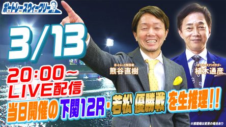 3月13日(月)20時から「ボートレースウィークリー」をLIVE配信!熊谷直樹さんがリモート出演!植木通彦ボートレースアンバサダーと当日開催の下関12Rと若松 優勝戦を生推理!YouTubeとBOATCASTで配信!