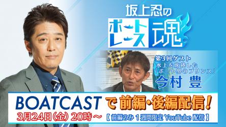 3月24日(金)20時から配信!坂上忍のボートレース魂 第3回ゲストはボート界のレジェンド今村豊さん。 坂上さんと今村さんが魂のボートレーストークを繰り広げます! ぜひご覧ください!