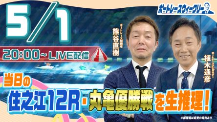 5月1日(月)20時から「ボートレースウィークリー」をLIVE配信!熊谷直樹さんがリモート出演!植木通彦ボートレースアンバサダーと【住之江12R・丸亀 優勝戦】を生推理!YouTube とBOATCASTで配信です!