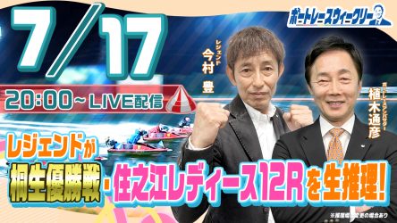 7月17日(月)20時から「ボートレースウィークリー」をLIVE配信!レジェンド今村 豊さんがリモート出演!植木通彦ボートレースアンバサダーと【桐生12R優勝戦】【住之江レディース12R】を生推理!YouTubeとBOATCASTで配信です!