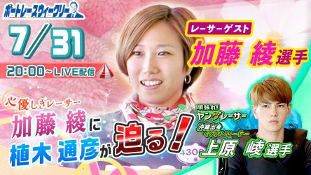 7月31日(月)は20時から「ボートレースウィークリー」をLIVE配信!今回は加藤綾選手がリモート出演!さらに、がんばれ!ヤングレーサーのコーナーでは沖縄出身イケメンレーサー上原崚選手を紹介!YouTubeとBOATCASTで配信です!