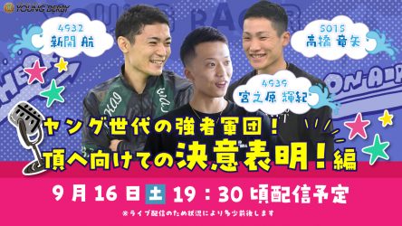 9月16日(土)19時30分から新開航選手、宮之原輝紀選手、高橋竜矢選手がトークライブを開催!! 「PG1ヤングダービー開幕直前スペシャルLIVE! 〜ヤング世代の強者軍団! 頂へ向けての決意表明!編〜」を BOATCASTとBOATRACE公式YouTubeで生配信!