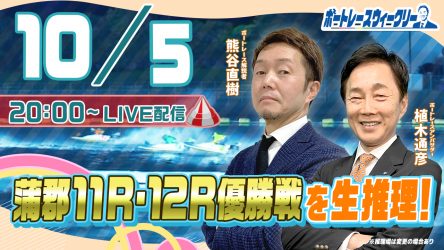 10月5日(木)20時から「ボートレースウィークリー」をLIVE配信!熊谷直樹さんがリモート出演!植木通彦ボートレースアンバサダーと【蒲郡11R&12R優勝戦】を生推理!YouTubeとBOATCASTで配信です!