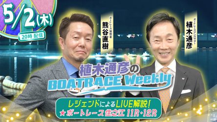 今回の「植木通彦のボートレースウィークリー」は5月2日(木)20時からLIVE配信!熊谷直樹さんが植木通彦ボートレースアンバサダーと【住之江11R&12R】をLIVE解説!