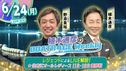 今回の「植木通彦のボートレースウィークリー」は6月24日(月)20時からLIVE配信!野添貴裕さんが植木通彦ボートレースアンバサダーと【住之江オールレディース11R&12R優勝戦】をLIVE解説!