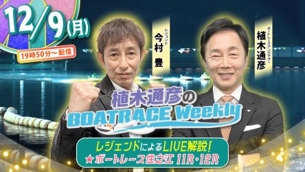 今回の「植木通彦のボートレースウィークリー」は12月9日(月)19時50分からLIVE配信!今村豊さんがリモート出演!植木通彦ボートレースアンバサダーと【住之江11R・12R】をLIVE解説!