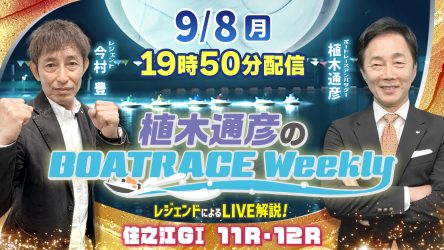 今回の「植木通彦のボートレースウィークリー」は9月8日(月)19時50分からLIVE配信!今村 豊さんがリモート出演!植木通彦ボートレースアンバサダーと【住之江G1 11R・12R】をLIVE解説!