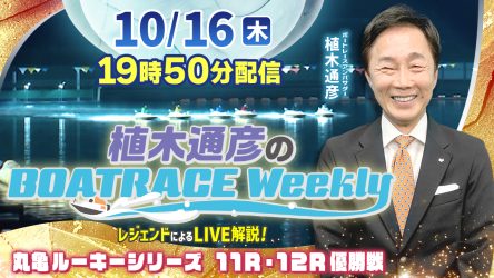 今回の「植木通彦のボートレースウィークリー」は10月16日(木)19時50分からLIVE配信!今回は植木通彦ボートレースアンバサダーが【丸亀ルーキーシリーズ12R優勝戦】をLIVE解説!質問も大募集!
