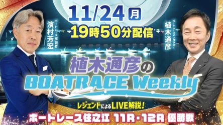 今回の「植木通彦のボートレースウィークリー」は11月24日(月)19時50分からLIVE配信!濱村芳宏さんがリモート出演!植木通彦ボートレースアンバサダーと【住之江11R・12R優勝戦】をLIVE解説!