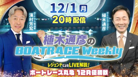 今回の「植木通彦のボートレースウィークリー」は12月1日(月)20時からLIVE配信!濱村芳宏さんがリモート出演!植木通彦ボートレースアンバサダーと【丸亀12R優勝戦】をLIVE解説!