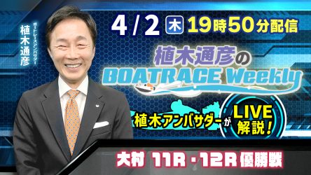 今回の「植木通彦のボートレースウィークリー」は4月2日(木)19時50分からLIVE配信!今回は植木通彦ボートレースアンバサダーが【大村11R・12R優勝戦】をLIVE解説!質問も大募集!