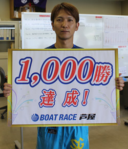 令和元年9月15日(日)、ボートレース芦屋「第10回ジャパンネット銀行賞」4日目第9レースにおきまして、登録第4324号 海野 康志郎選手(山口)が5コースから見事なまくり差しを決め、通算1,000勝を達成しました。